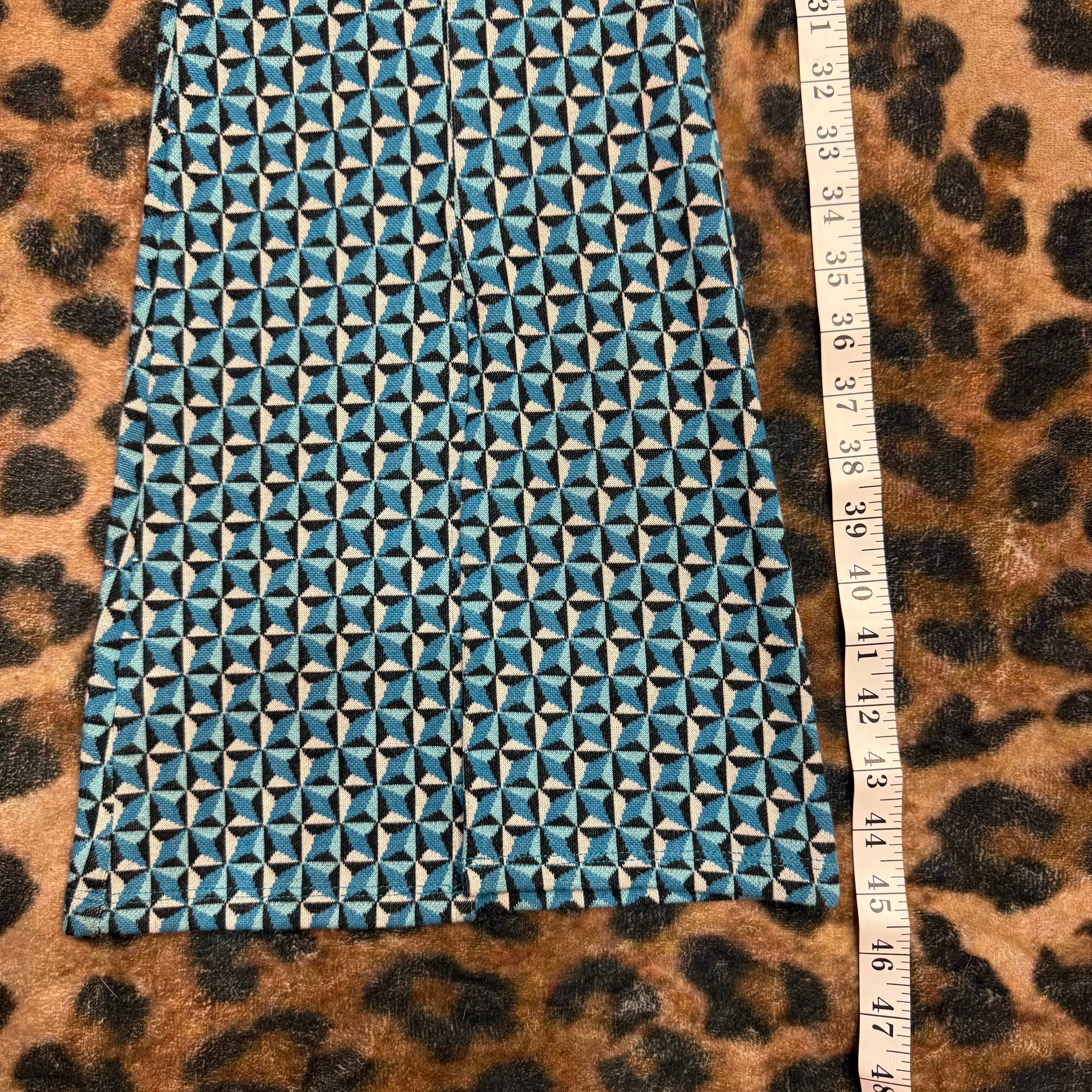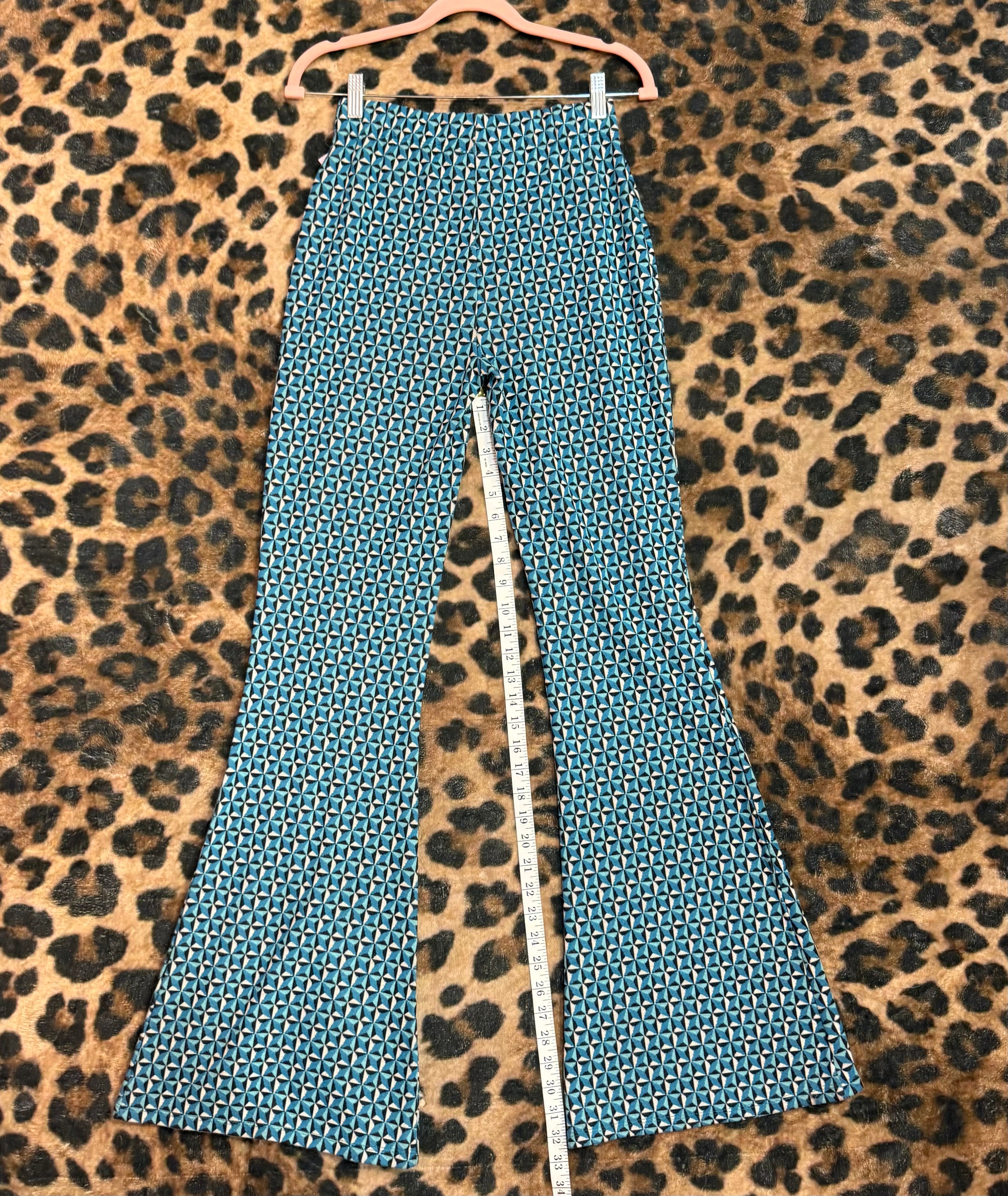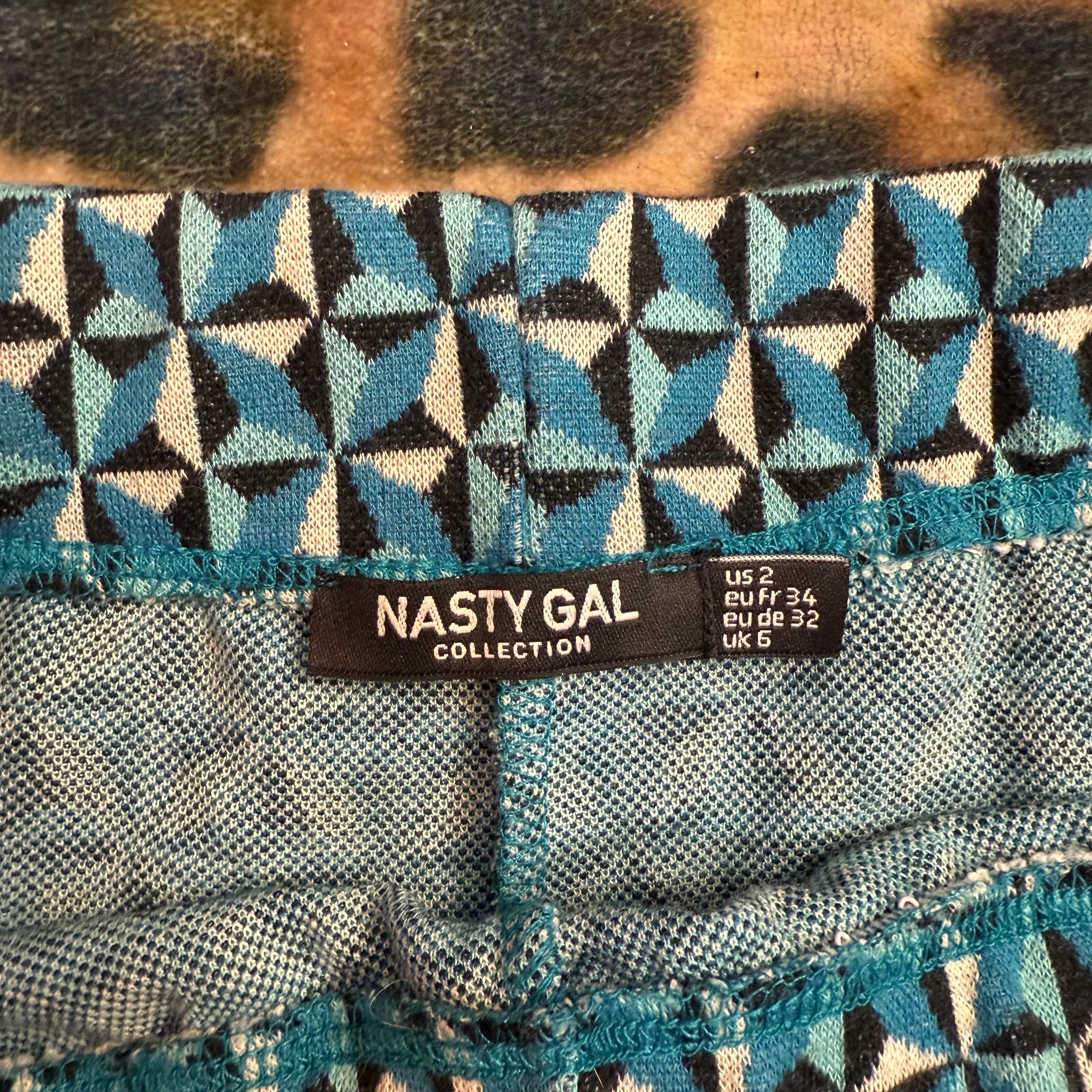 Retro-inspired statement in these Nasty Gal geometric flare pants. Designed in a striking teal and black all-over print, these high-waisted pants hug the waist and hips before flaring out into a flattering, leg-lengthening silhouette. The stretchy fabric moves with you, making them just as comfortable as they are eye-catching.