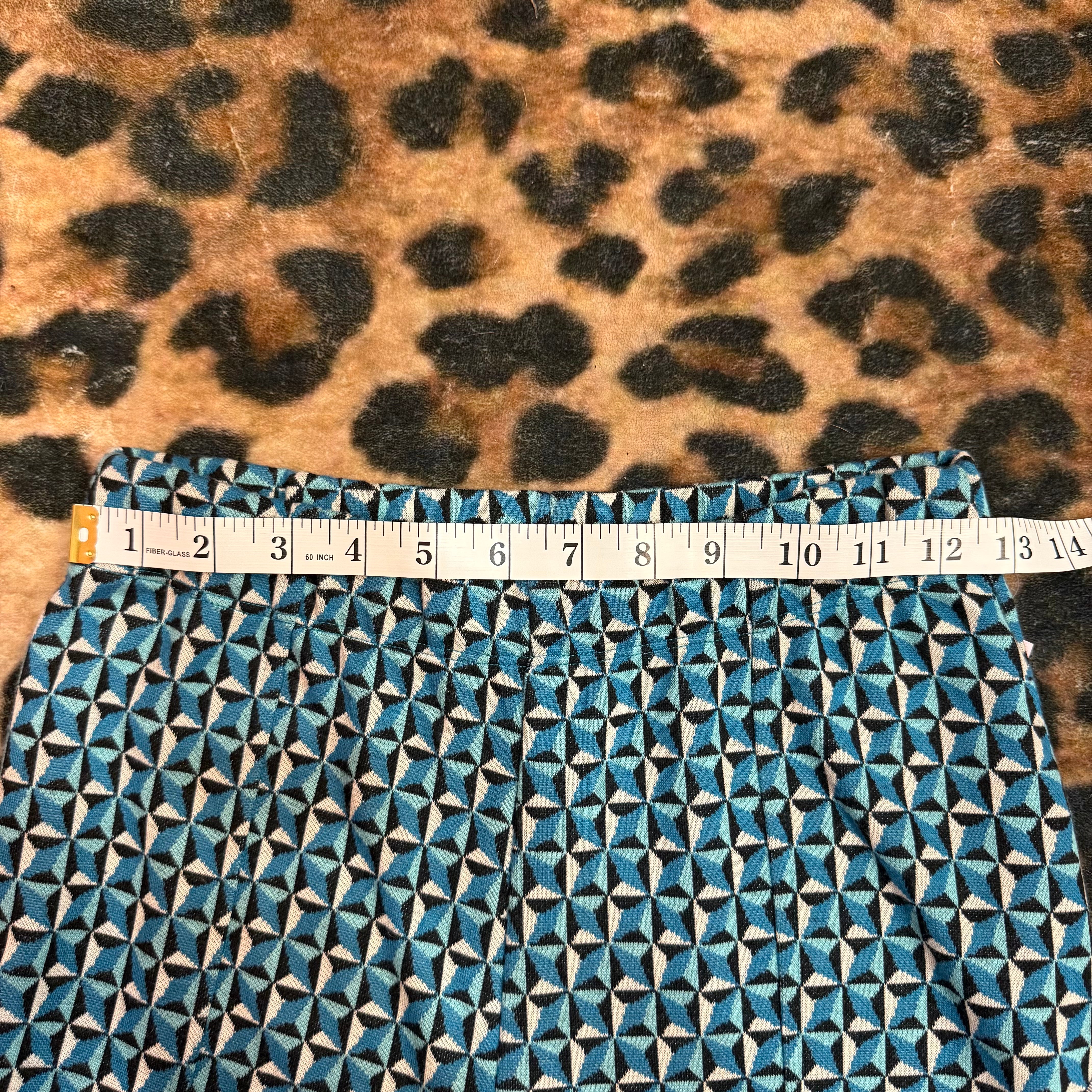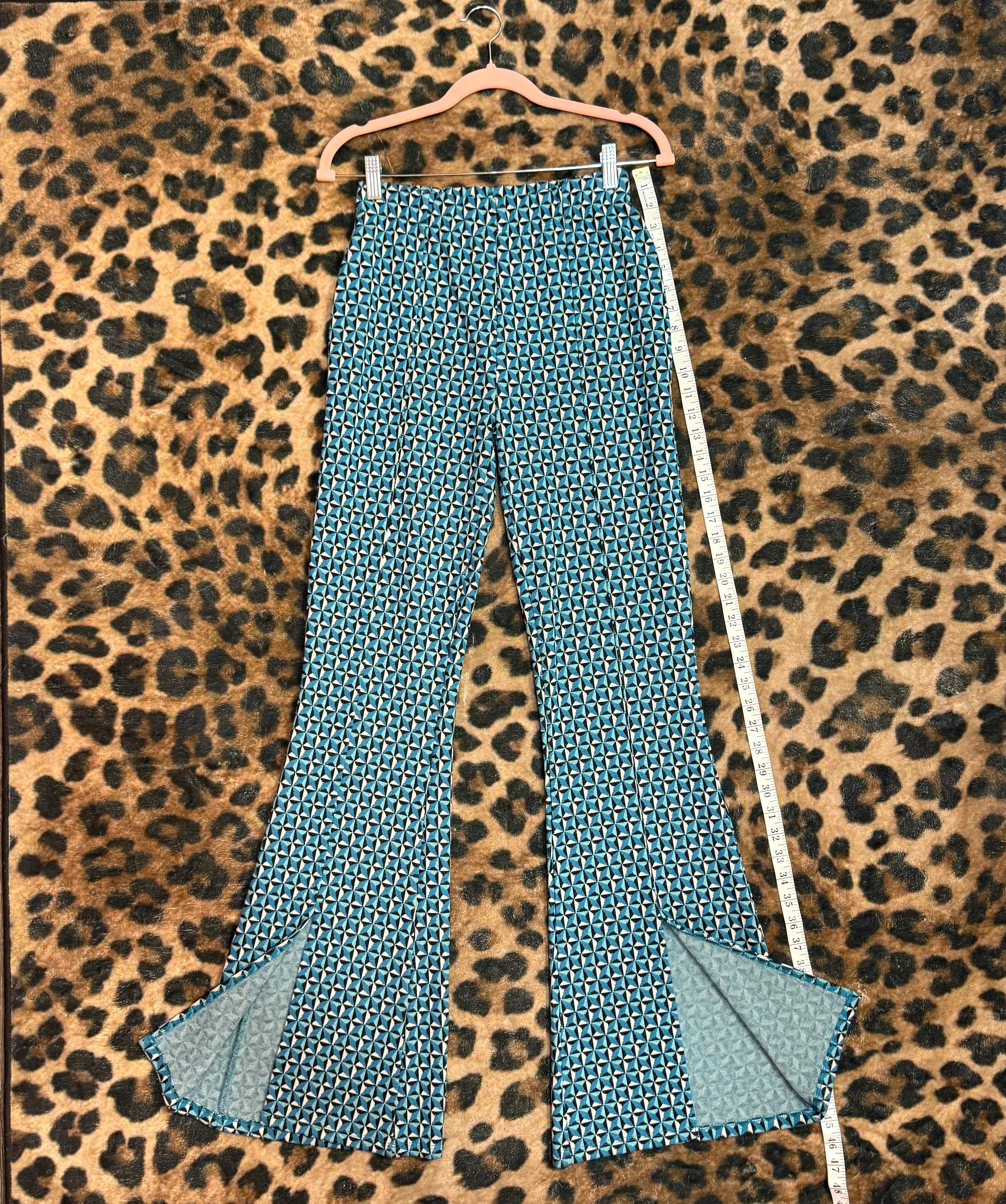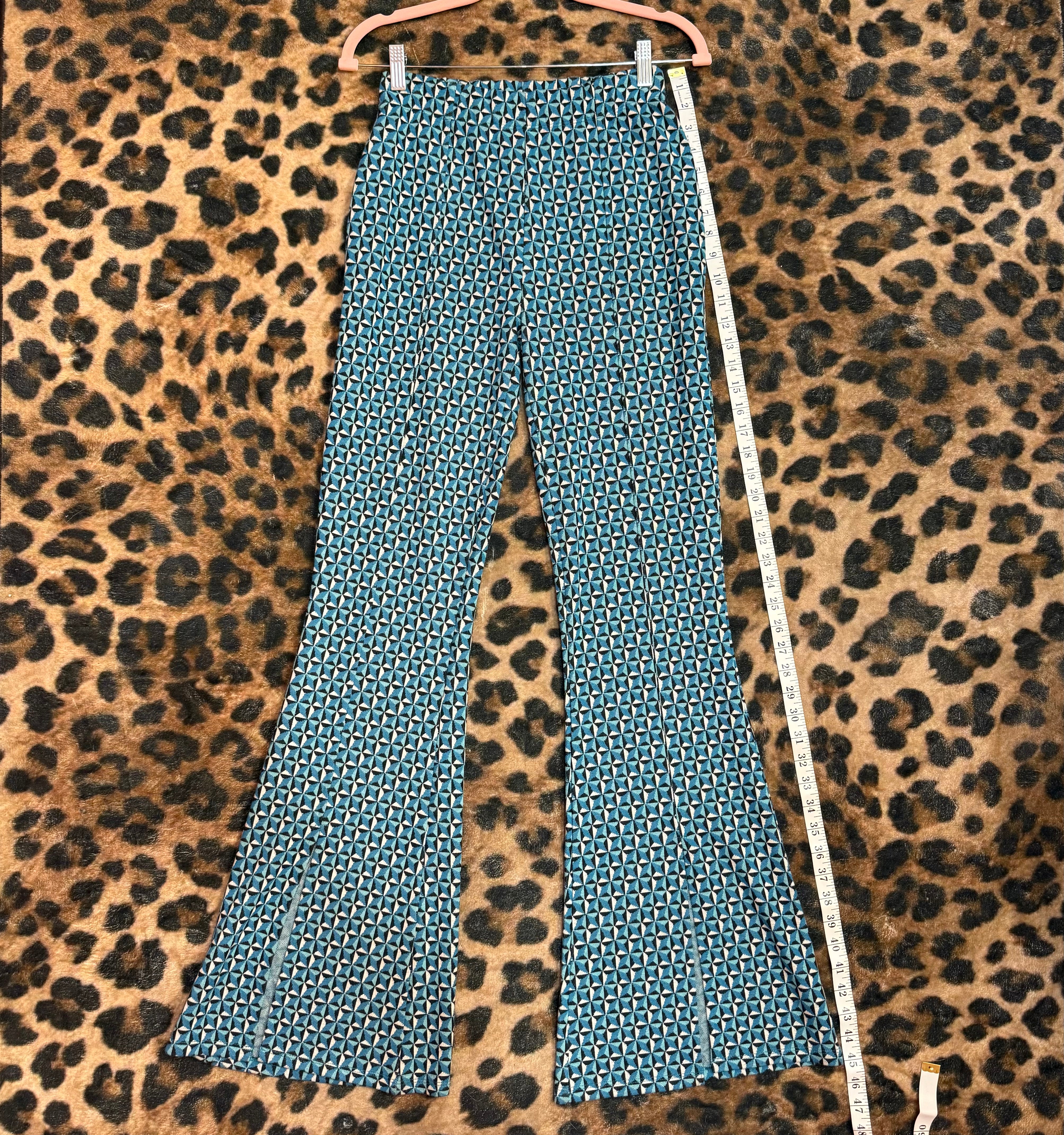 Retro-inspired statement in these Nasty Gal geometric flare pants. Designed in a striking teal and black all-over print, these high-waisted pants hug the waist and hips before flaring out into a flattering, leg-lengthening silhouette. The stretchy fabric moves with you, making them just as comfortable as they are eye-catching.