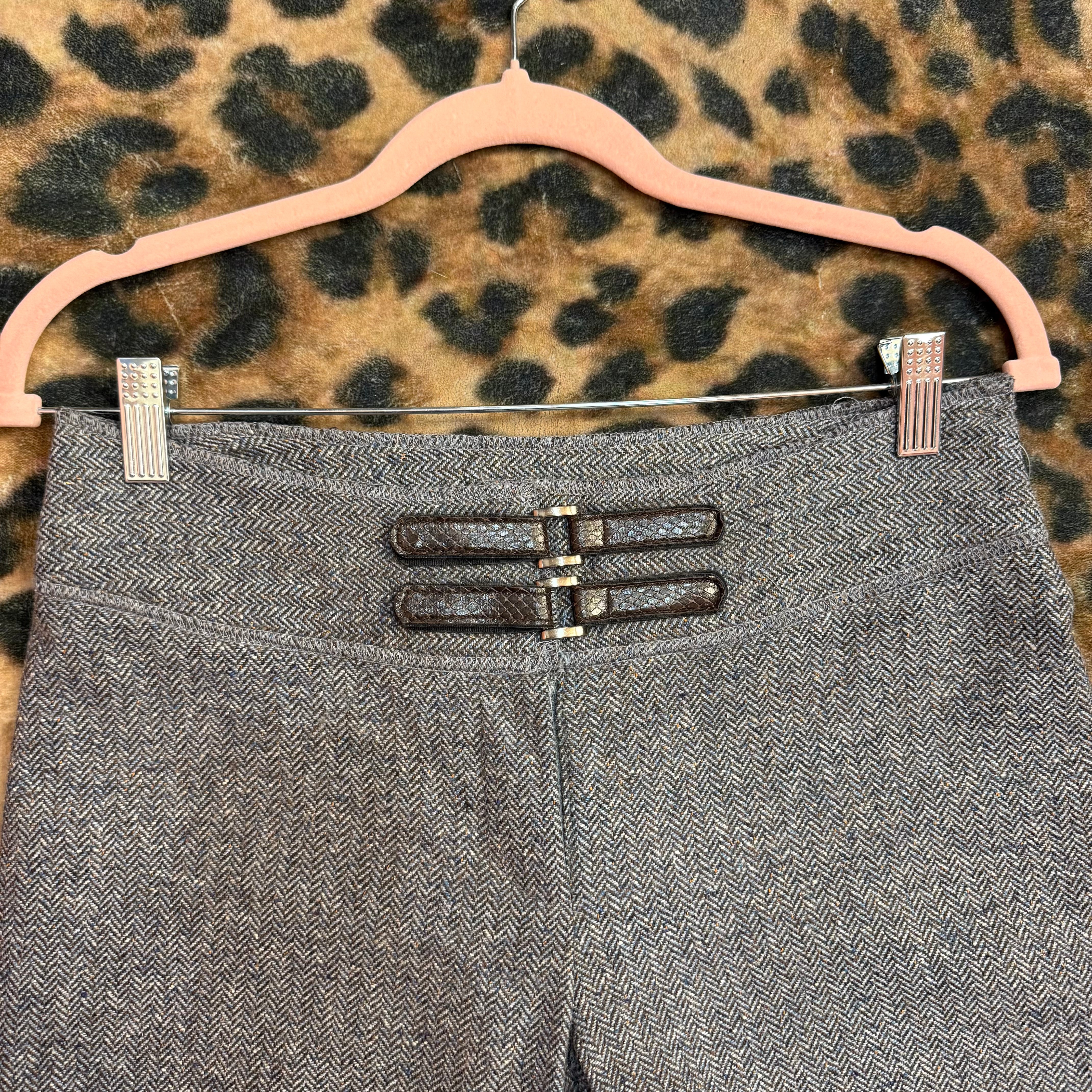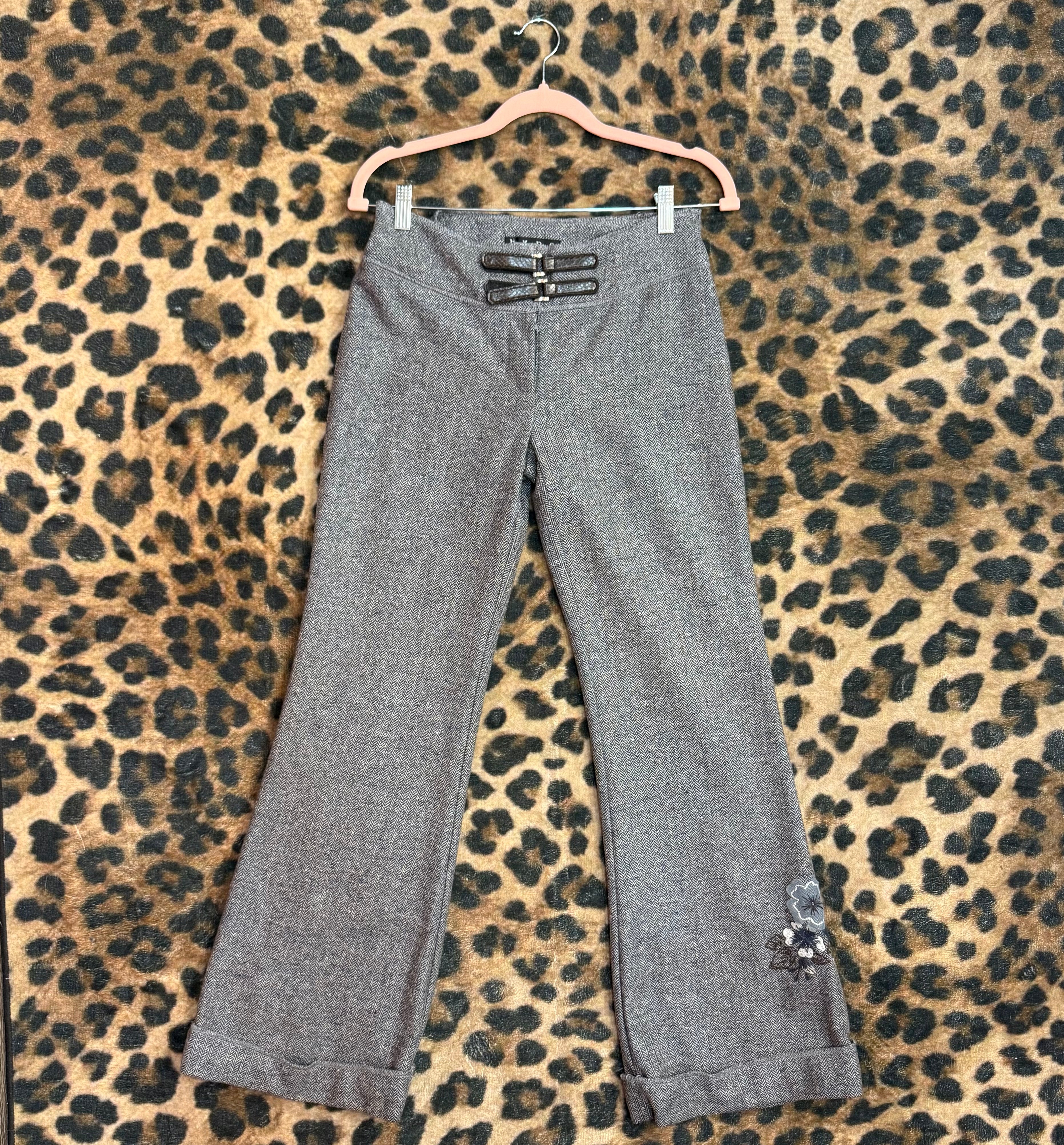 Shop tweed pants with floral embroidery. These high-waisted gray tweed pants feature a straight-leg fit, cuffed hem, front buckle detail, and delicate embroidered floral accents. A timeless yet feminine piece perfect for workwear, vintage-inspired outfits, or elevated everyday looks.