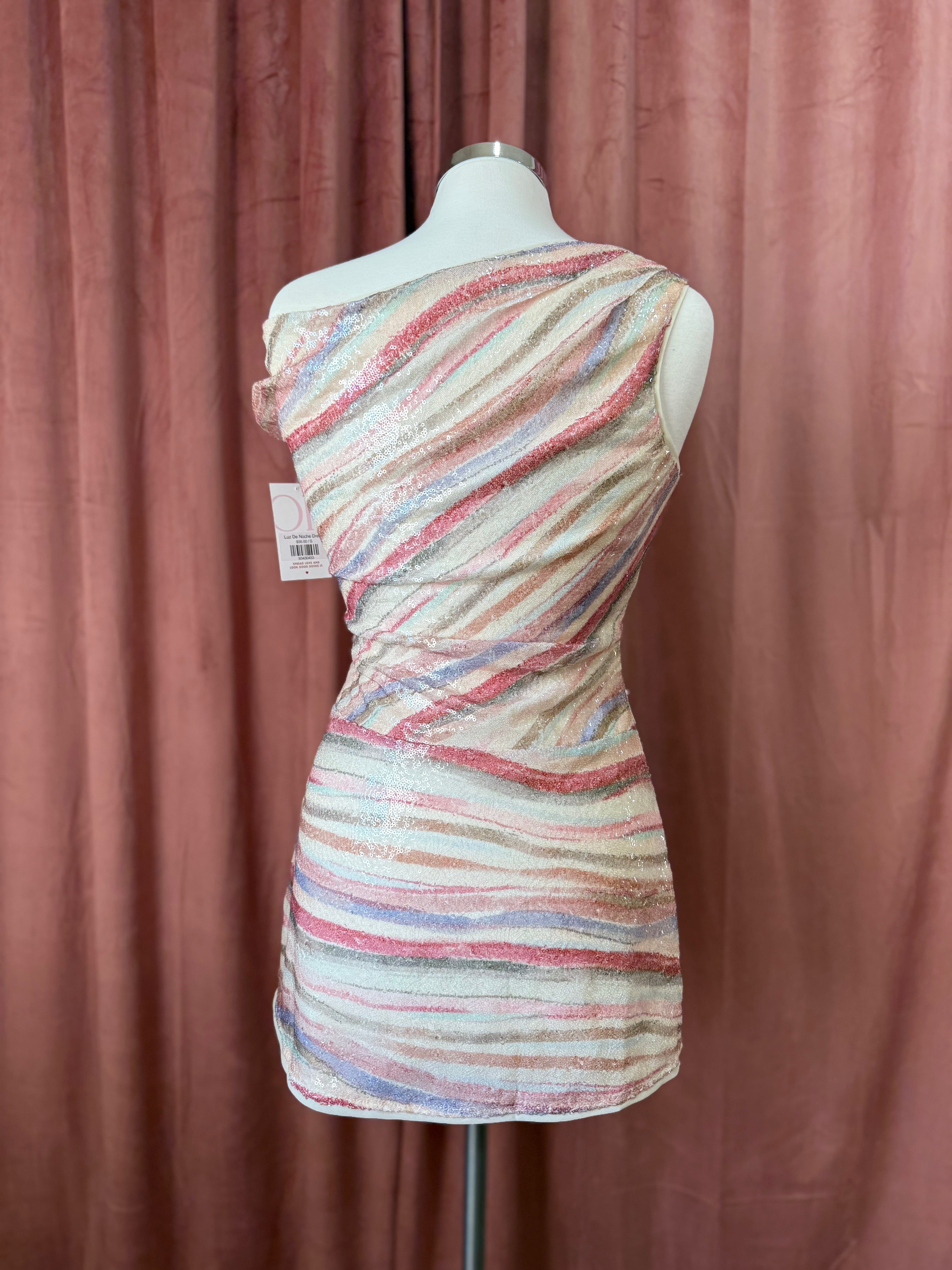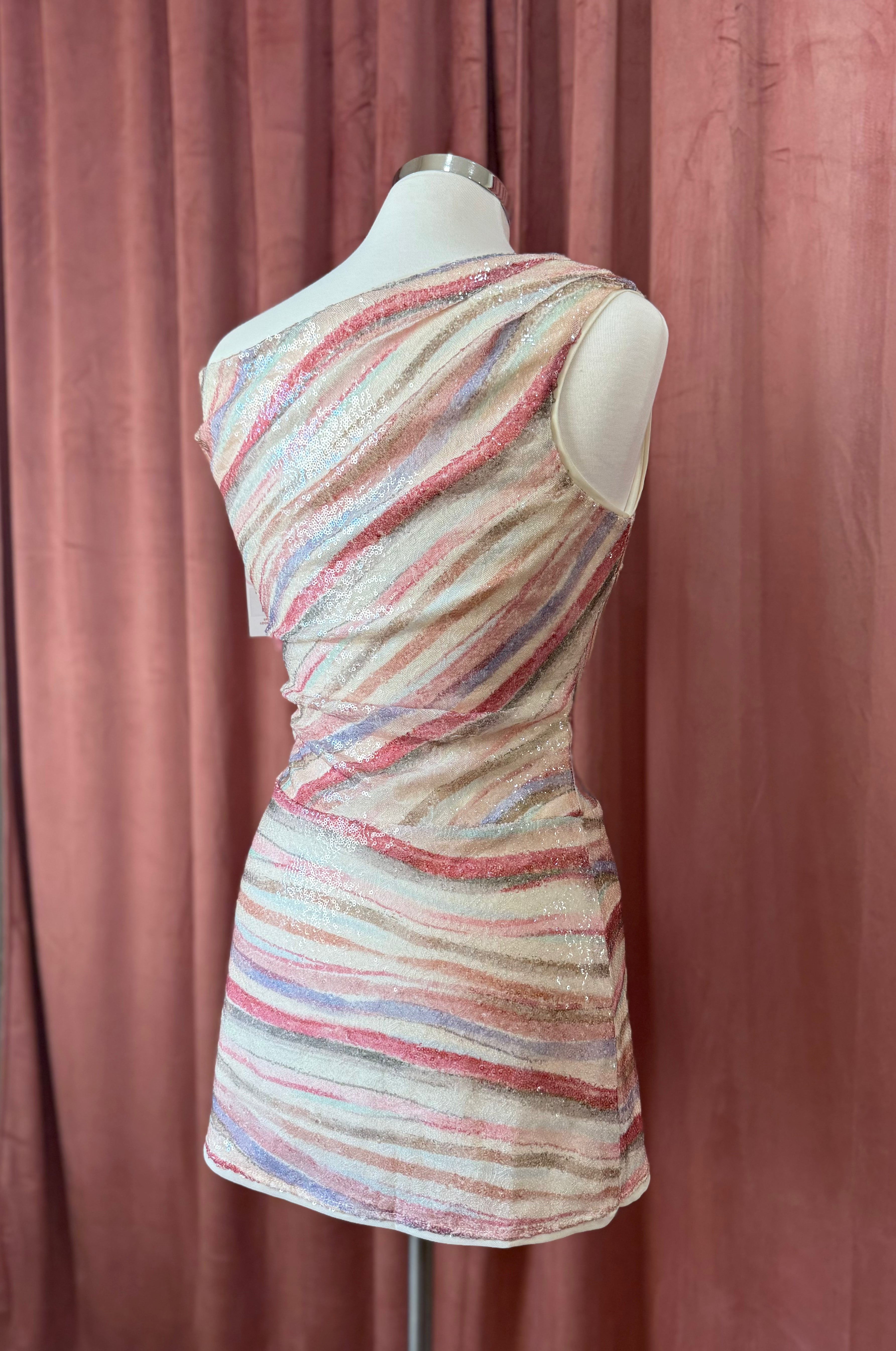 The Luz de Noche minidress features a chic asymmetric neckline and soft, sparkly pastel stripes that shimmer with every move. The body-hugging silhouette highlights your curves while the glittered fabric gives you a radiant, party-ready glow.